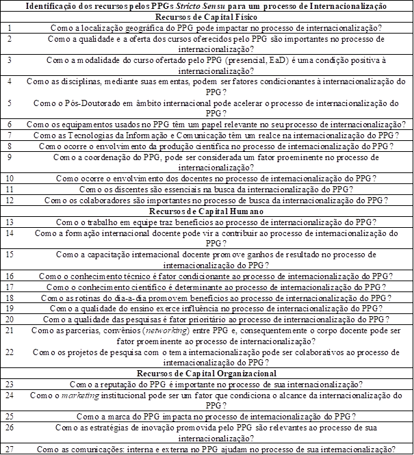 As entrevistas foram fundamentais para se mapear uma lista de recursos estratégicos que são assimilados pelos PPGs Stricto Sensu para o processo de internacionalização, e estes peritos (entrevistados) são sabedores de informações úteis, de observações e impressões importantes para estruturar os citados recursos estratégicos. Posto isto, uma listagem dos recursos estratégicos foi enviada, por meio de perguntas, utilizando uma survey (Figura 2) para professores/pesquisadores dos PPGs Stricto Sensu das áreas de Administração Pública e de Empresas, Ciências Contábeis e Turismo do Brasil para que respondessem quais recursos estratégicos são preponderantes para o processo de internacionalização destes PPGs? Salienta-se que, ao constituir-se de uma amostra intencional, os achados desta pesquisa não podem ser generalizadas (Nassif & Hanashiro, 2002).