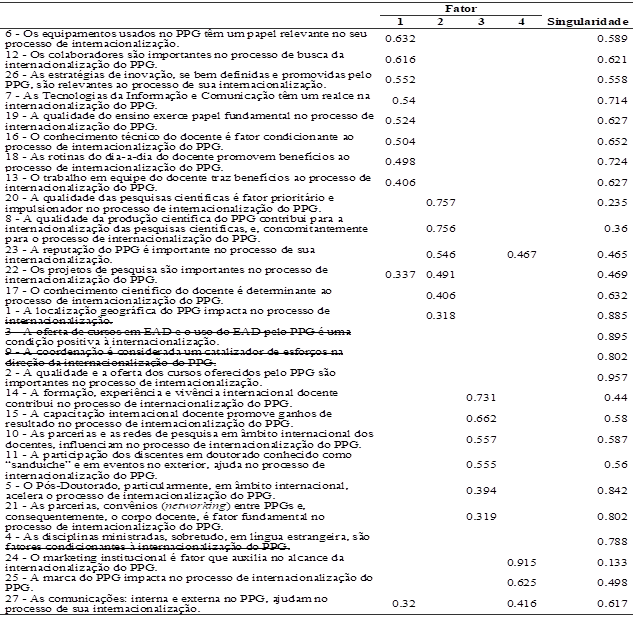 Foram usadas 27 perguntas para mensurar o grau de internacionalização dos programas de pós-graduação stricto sensu de acordo com seus recursos estratégicos, as quais podem ser vistas na Figura 3. Uma análise fatorial exploratória (AFE) com o método de rotação maximum likelihood e o procedimento de extração Oblimin (Rogers, 2022), uma vez que há correlação entre as variáveis, revelou quatro fatores para o resultado final.