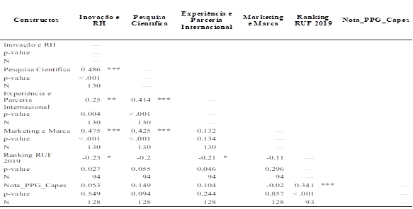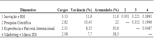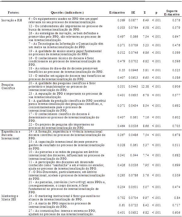 A terceira e quarta dimensões explicam respectivamente 8,55% e 7,7% da variância e são definidas como Experiência e Parceria Internacional (Fator 3), e, por fim, Marketing e Marca (Fator 4) da IES. Salienta-se que, no que se refere ao Fator 3, é prudente afirmar que, os pesquisadores nacionais com network, e, concomitantemente, vivência intercional, influenciam na proliferação de pesquisas científicas internacionais, colaborando assim para o fomento de estudos científicos de qualidade em seus respectivos PPGs (Neves & Barbosa, 2020). E, no que tange ao Fator 4, o investimento em marketing fortalece as políticas de cooperação interinstitucional e internacional dos PPGs das IES, impactanto na continuidade do conhecimento científico destes programas (Ribeiro & Forte, 2020b). Logo, a intercorrelação entre os fatores (ou intercorrelação entre dimensões dos construtos latentes) é significativa, com maior correlação entre inovação e RH e marketing e marca (r = .38). reforça-se que estas quatro dimensões são atreladas aos recursos estratégicos identificados e, que de certa forma podem ou não influenciar no processo de internacionalização do PPG da respectiva IES.