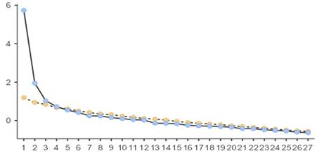 Para que se conseguisse extrair o número de fatores à esquerda, e, para se demonstrar a análise visual da variância destes componentes principais, foi usado o teste do scree-plot (Dias, Silva & Macedo, 2019), que mostrou o número de dimensões, evidenciando assim os quatro fatores (Figura 5) para a AFE dado a existência das vinte de sete questões (Figura 3). Enfatiza-se e reforça-se que o eixo X da Figura 5 vislumbra as 27 questões (Figura 3) e o eixo Y da mencionada figura contempla os quatro fatores observados na Figura 3 e, descritos na Figura 4.