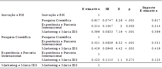 A análise fatoria confirmatória utiliza erros (ver SE) e gera coeficientes padronizados (ver estimativas). Os resultados mostraram uma correlação significativa entre as quatro dimensões usando construtos latentes (exceto pela associação entre experiência e parceria internacional e marketing e marca da universidade r = 0,27; p<0,12). A análise fatorial confirmatória (AFC) gerou o seguinte índice de ajustamento (CFI = .83, TLI = .81, RMSEA = .07, x2 = 359, df = 203, p<.001).