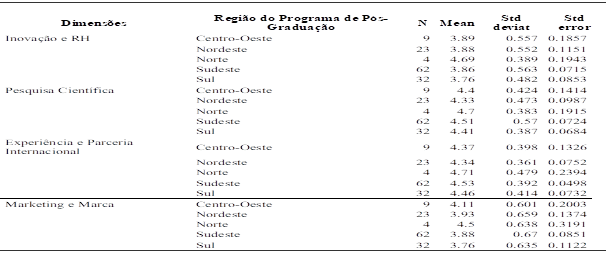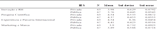 O achado mostrou que há diferença significativa nas médias para Inovação e RH (F = 5.65; p<0,019; Mprivada = 3,98 Mpúblico = 3,76, Tukey p<0,01), Pesquisa científica (F = 3.93; p<0,049; Mprivada = 4,54 Mpúblico = 4,37, Tukey p<0,04) e Experiência e parceria internacional (F = 3.67; p<0,057; Mprivada = 4,54 Mpúblico = 4,41, Tukey p<0,059). Em todos esses três casos, a universidade privada possui escores maiores de internacionalização e os mesmos são diferentes estatisticamente. Nota-se que o processo de internacionalização é condição sine qua non para se gerar vantagem competitiva acadêmica nos PPGs, contudo, é salutar sempre questionar se todos os programas têm vocação para internacionalização, pois, muitos PPGs podem ser mais eficazes de acordo com sua atuação, localização regional, gerando impactos assim na sociedade e na formação de pessoal (Nossa, 2022).