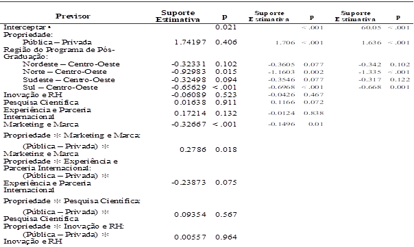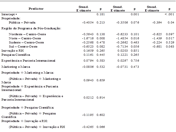 As quatro dimensões não explicaram os escores da avaliação na pós-graduação (sendo, Inovação e RH β = 0.02 p=ns; Pesquisa Científica β =0.12, p=ns; Experiência e Parceria Internacional β = 0.029 p=ns e Marketing e Marca β =-0.07 p=ns). O R2-ajustado foi de 8%, e sua diferença para o modelo anterior não foi significativa. O resultado do terceiro modelo mostrou e suportou o papel moderador da propriedade da instituição. Há uma interação entre propriedade e inovação e RH (β = -.42; p<0,06).