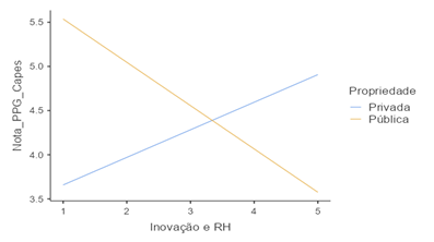 Fonte: Dados da pesquisa (2022)Por conseguinte, a interação sugere que quanto maior a inovação e RH na IES privada, a relação com a Nota_PPG_Capes é positiva, aumentando de 4,38 até 4,73. Contrariamente, quanto maior a inovação e RH na IES pública, a relação com a Nota_PPG_Capes é negativa, reduzindo de 4,40 até 3,86.