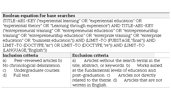 The researched databases chosen were Scopus and Web of Science, which have international scientific recognition and are multidisciplinary, and the Eric database, which is supported and specific to the educational area, adapting to the type of study proposed here. There was no distinction between empirical or non-empirical, qualitative or quantitative works, considering one of the desired objectives: to analyze the learning theories involved. The search for data in the databases took place in September 2022 and the database was updated in September 2023. A Boolean search equation was established (Table I) to account for the variety of synonyms and linguistic variations of the main terms. Inclusion and exclusion criteria were also established (Table I). The research included only undergraduate courses, as it is part of a macro study of entrepreneurship education in vocational education.