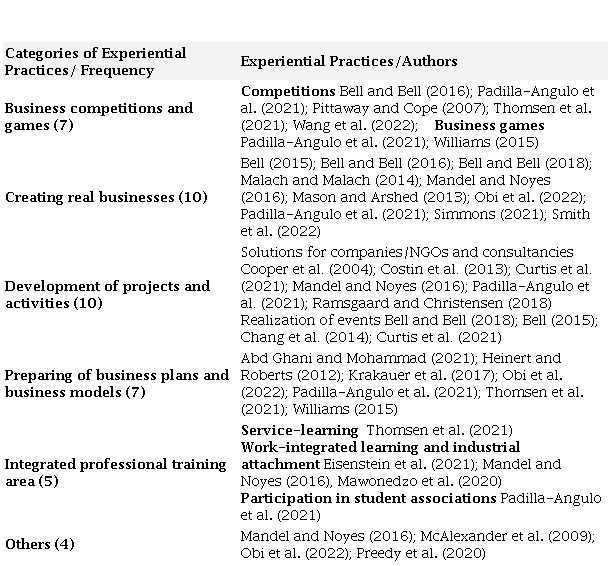 Experiential practices have an active character, involving students in situations that go beyond the simple passive absorption of content. They allow immersion in real or simulated contexts that facilitate the development of skills and an entrepreneurial mindset (Bell & Bell, 2020), increased creativity (Kakouris, 2015), identification of opportunities (Costa et al., 2018), generation of entrepreneurial intentions in students (Warhuus et al., 2018), and opportunities to acquire knowledge in social entrepreneurship (Thomsen et al., 2021).
