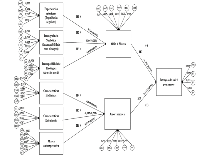When analyzing the inter-group correlations, it is clear that all of them are negative. This shows that love and hate and their antecedents have antagonistic behaviors. In modulus, the highest correlation coefficient (-0.853) was between Hedonic Characteristic and Negative Experiences. The correlation coefficient between Structural Characteristic and Symbolic Incongruence (-0.452) presented the lowest absolute value. Finally, when analyzing the correlation coefficients between the constructs of Love and Hate and their antecedents with the intention of remaining, it is verified that in the group Love to the brand, the highest correlation coefficient is386, between Hedonic Characteristics and Intention to Remain; and the lowest coefficient is 0.256, between Structural Characteristics and Intention to Remain. In the Brand Hate group, the highest value is -0.352, between Symbolic Incongruity and Intention to Remain; and the lowest value is -0.413 between Brand Hate and Intention to Remain.