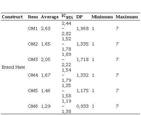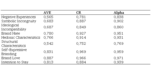 The relationship between Negative Experience and Brand Hate is in line with Salvatori (2007) when he states that this antecedent refers to the relationship with the brand that, at a given moment, generates a negative experience marked enough to generate brand aversion. On the other hand, the lowest correlation (0.795) is between Symbolic Incongruence and Ideological Incompatibility.