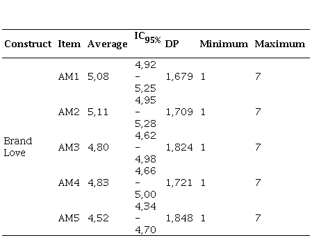 Considering the averages, table 2 shows AM2 (My HEI's brand makes me feel good.) presented the highest value (5.11), which represents a higher agreement of respondents regarding how they feel about their HEI's brand. On the other hand, item AM5 (I love my HEI's brand.) showed the lowest value (4.52), which represents a lower agreement of the respondents regarding the love they feel for their HEI. However, the averages presented in this construct are high, indicating that the respondents showed high indexes in relation to the love for their HEI's brand.