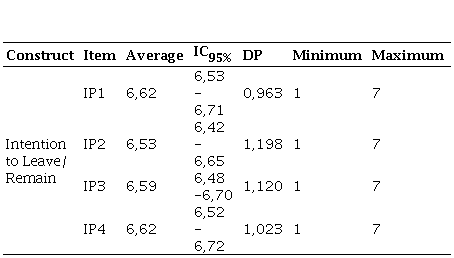 Table 3 explains that, considering the averages, IP1 (I intend to graduate in the HEI I currently study.) presented the highest value (6.62), which represents a higher agreement of respondents regarding the intention to graduate in their HEI. On the other hand, item IP2 (I intend to stay in this course in this HEI.) presented the lowest value (6.53), which represents a lower agreement of the respondents regarding the intention to stay in the course in their HEI. However, the averages presented in this construct are high, indicating that the respondents showed high indexes in relation to the intention to leave/stay.