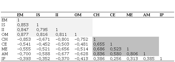 Table 5 shows that in the first group, highlighted in blue, there are the correlations of the construct hate to the brand and its antecedents. It is verified that all correlations are positive, which indicates a behavior of the set of these constructs. The highest correlation coefficient (0.877) is between Negative Experience and Brand Hate. On the other hand, the lowest correlation (0.795) is between Symbolic Incongruity and Ideological Incompatibility.
