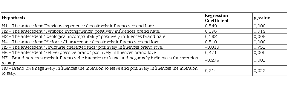 The hypothesis H7 - Brand hate positively influences the intention to leave and negatively influences the intention to stay was significant, since it presented a p value of less than 0.05 (0.003), in line with Lee et al. (2009), when they state that the main behaviors of a consumer who develops brand hate are brand switching or avoidance, brand rejection, negative "word of mouth", online complaint, revenge and market aggression.