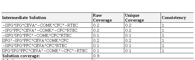 These combinations provide a detailed view of how different sets of factors can lead to the desired outcome. The total coverage of 0.9 indicates that 90% of the cases in the dataset are covered by the identified combinations of conditions. The total consistency of 1 means that all identified combinations of conditions are perfectly consistent; that is, in all cases where these combinations are present, the desired outcome is also present.
