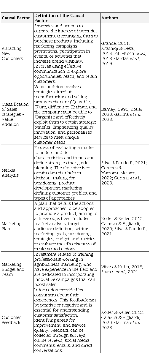 To understand the combinations of causal conditions driving the economic growth of family agribusinesses in the region, variables under four main constructs were investigated: Resource Management, Institutions, Process Management, and Consumer Relationship (Kaplan & Beinhocker, 2003; Batalha, Buainain, & Souza Filho, 2005; Alvarez & Barney, 2007; Kotler & Keller, 2012; Taboada, Zapata, Pérez, & Guerra, 2014; Dominic & Theuvsen, 2015; Jansik & Irz, 2015; Pindado, Sánchez, Verstegen, & Lans, 2018). These constructs point to variables that contribute to the economic growth of agribusiness. Economic growth refers to effective financial management that ensures profitability and positive cash flow, with controlled and sustainable business expansion, represented by revenue increases, comparing the result of one year with the next (Barney, 1991).