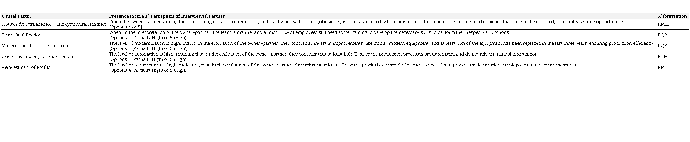 The choice of Crisp-Set Qualitative Comparative Analysis (csQCA) justifies the study by examining multiple trajectories that lead to similar outcomes. Researching the factors of competitiveness, creation, and management of dairy agribusinesses in Santa Catarina, Brazil, addresses economic, social, and environmental issues, contributing to the continuity of family agribusiness (Alvarenga, Gajo, & Aquino, 2020; Schaefer, Etges, & Schaefer, 2023). Analyzing these factors contributes to regional economic development, showing the interconnection between innovation, technology, and sustainability in the agricultural sector. It reinforces the importance of the dairy industry for the local economy, highlighting the need for policies that foster innovation and competitiveness. It also aids in decision-making to generate academic knowledge, promote sustainability, and improve business strategies.