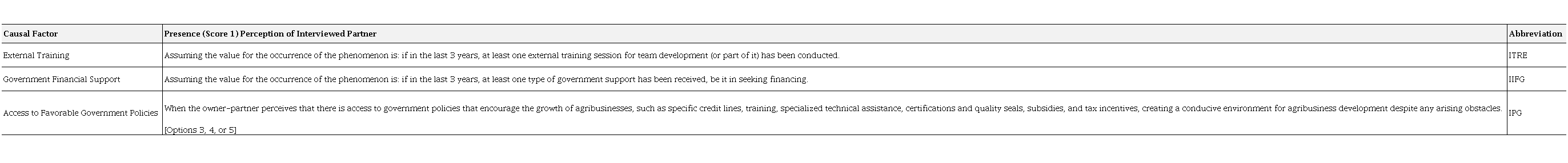The Table 6 highlights three causal factors related to institutions that influence the growth of family agribusinesses. The first is external training (ITRE), the second is government support in financing (IIFG), and the third factor is access to favorable government policies (IPG). These factors will also be tested to determine if their presence creates a favorable environment for the development and competitiveness of family agribusinesses.