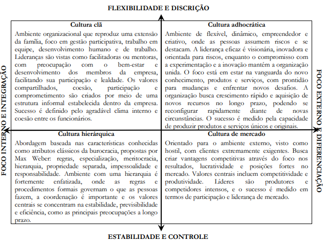 Fundamentado nessas premissas, emergem quatro tipos culturais (Figura 1): Clã, que enfatiza a colaboração e os valores compartilhados; Adhocrática, que é inovadora e flexível; Hierárquica, que é estruturada e orientada para a estabilidade; e a de Mercado, que é focada em resultados e competição. Esse modelo permite às organizações compreender sua cultura predominante e a adaptá-la de acordo com seus objetivos estratégicos, reconhecendo que as culturas podem ter elementos de mais de um tipo ou evoluir ao longo do tempo (Cameron & Quinn, 2006).