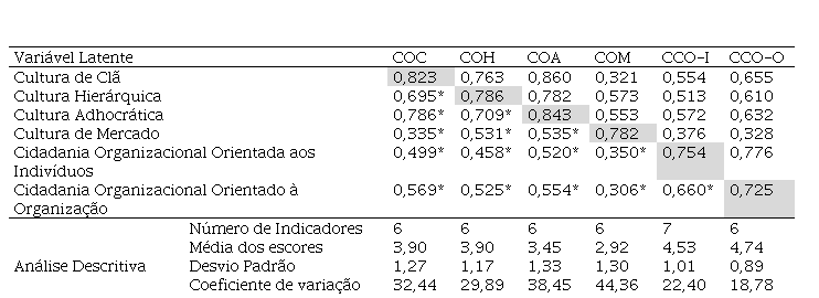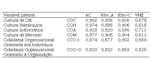 Na avaliação do modelo de mensuração, foram observadas cargas fatoriais satisfatórias e capazes de explicar a maior parte (mais de 50%) da variância das variáveis latentes. Portanto, praticamente todos os indicadores previstos inicialmente permaneceram no modelo final. A única exceção ocorreu com o indicador de comportamento de cidadania organizacional orientada para a organização (CCO-O), expresso pela afirmativa “Eu tomo providências (no exercício de minhas atividades) para proteger a organização de possíveis problemas”. Esse indicador, cuja carga fatorial foi de 0,624, foi excluído para melhorar a Variância Média Extraída (VME) e, com isso, adequar a validade convergente da variável CCO-O. Como mostra Tabela 1, com a exclusão do indicador acima, todos os construtos alcançaram VME superiores a 0,526, atendendo aos critérios de Hair et al. (2019), que recomendam VME maiores que 0,500 (50%) para a presença de validade convergente.