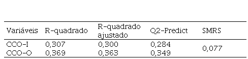 A avaliação do modelo estrutural foi iniciada pela observação dos coeficientes de determinação de Pearson, utilizados para medir o poder explicativo das variáveis exógenas (r-quadrado). Portanto, como mostra a Tabela 3, foi possível constatar que a cultura organizacional (CO) explicou 30,7% da variância do CCO-I e 36,9% do CCO-O. Nesse sentido, ao tratar do poder explicativo de modelos estruturais, Hair et al. (2019) destacam que, de maneira geral, r-quadrados de 0,25 expressam fraca capacidade explicativa, 0,50, moderada, e 0,75 expressam alta capacidade explicativa. Portanto, tomando por base os parâmetros de Hair et al. (2019), é possível considerar que a CO é capaz de explicar parcelas moderadas da variância do CCO, condição que sugere capacidade explicativa razoável.