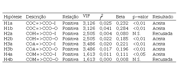 Quanto à cultura adhocrática (COA), todas as hipóteses (H3a e H3b) foram confirmadas, evidenciando a influência positiva no CCO-I, H3a, β=0,221, e CCO-O, H3b, β=0,196. Por sua vez, a cultura de mercado (COM) assim como a hierárquica mostraram evidências estatísticas suficientes para confirmar apenas uma das duas hipóteses, a H4a. Esse aspecto sugere que a COM contribui para aumentar a CCO-I, H4a, β=0,111, uma vez que o p-valor maior que 5% encontrado na segunda hipótese H4b não forneceu evidências estatísticas de haver relação significativa entre COM e CCO-O.