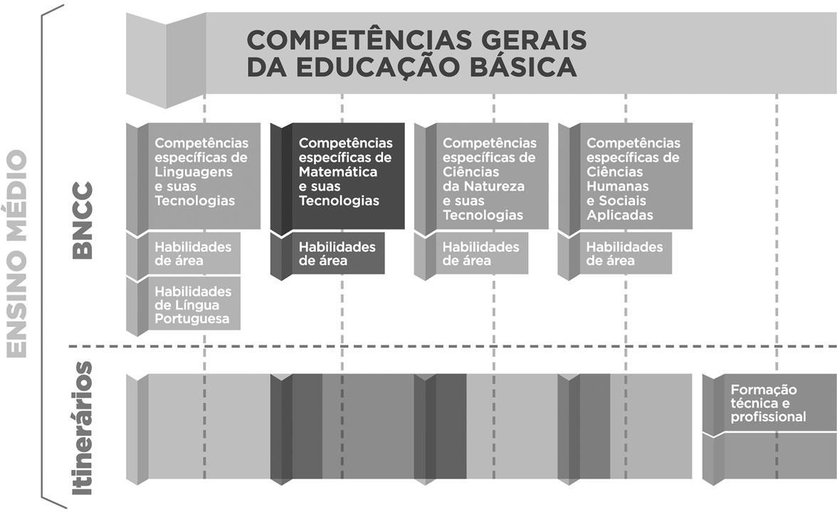 A partir do aumento da carga horária e dos objetivos definidos para o desenvolvimento da juventude cidadã e integrada ao mundo do trabalho, os estudantes deverão obrigatoriamente receber uma Formação Geral Básica relacionada às áreas de conhecimento gerais e dividida em: Linguagens e suas Tecnologias; Matemática e suas Tecnologias; Ciências da Natureza e suas Tecnologias; Ciências Humanas e Sociais Aplicadas. Além da Formação Geral Básica, os estudantes receberão uma formação relacionada aos itinerários formativos, com os objetivos de aprofundar a aprendizagem, consolidar a formação integral, promover valores universais e desenvolver habilidades. A composição curricular do Novo Ensino Médio, representada pela Formação Geral Básica e itinerários formativos, está ilustrada na Figura 2.