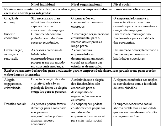 A partir do entendimento de que a educação para o empreendedorismo está relacionada à criação de valor para as pessoas, Lackéus (2015) apresenta a relevância e importância do tema em diversos níveis da sociedade e a eficácia de sua aplicação. A Figura 3 demonstra o mapeamento realizado pelo autor.