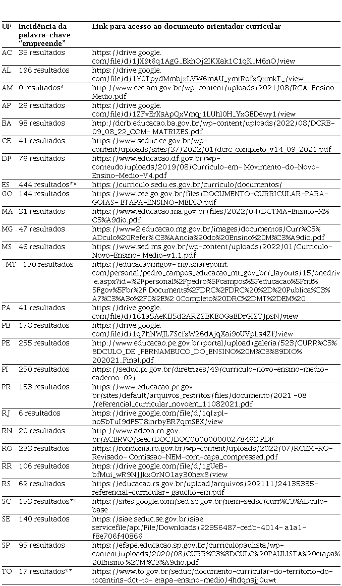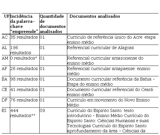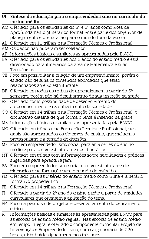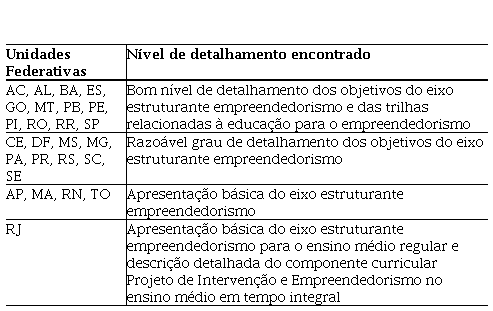 A Tabela 4 apresenta a síntese das informações relacionadas à educação para o empreendedorismo no ensino médio encontradas nos documentos orientadores de cada unidade federativa.