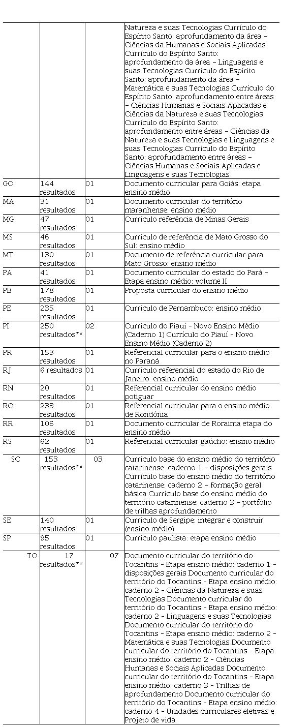 ** Os referenciais curriculares relacionados ao ensino médio estavam contidos em diversos materiais, a quantidade presente na tabela contempla a soma dos achados em todos os documentos