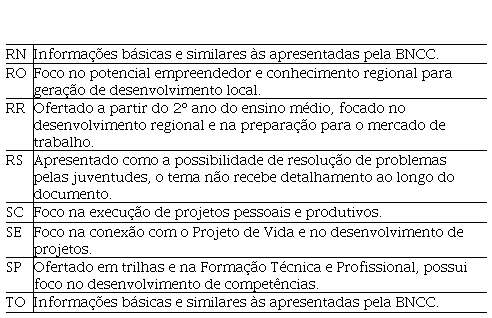 Os documentos orientadores curriculares do Amapá, Maranhão, Rio de Janeiro, Rio Grande do Norte e Tocantins, apresentam apenas os eixos estruturantes dos itinerários formativos, dentre eles o empreendedorismo, contendo informações similares ao detalhamento do mesmo conteúdo na BNCC, sem maiores elementos sobre a grade curricular ou questões metodológicas.