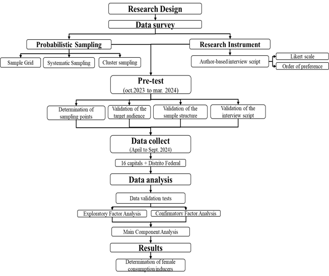 The methodology employed was supported by three probabilistic procedures that guided the data collection process. These encompassed the sample size, the determination of data collection locations, the definition of the target audience, and the specification of periods, times, and the structure for data collection and analysis.