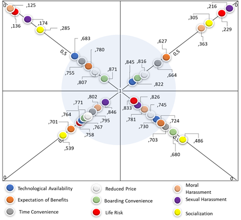 During the night and late-night periods, these dimensions become less frequent, reducing the importance of the variable Risk to Life, while factors such as cost, technological accessibility, and expectation of benefits prevail.