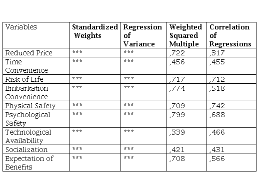 Moreover, the Regression Correlations indicate that Price Reduction, Time Convenience, Technological Availability, and Socialization present moderate correlations, whereas Risk to Life, Boarding Convenience, Physical and Psychological Safety, and Expectation of Benefits show high interrelations with the other variables under analysis.