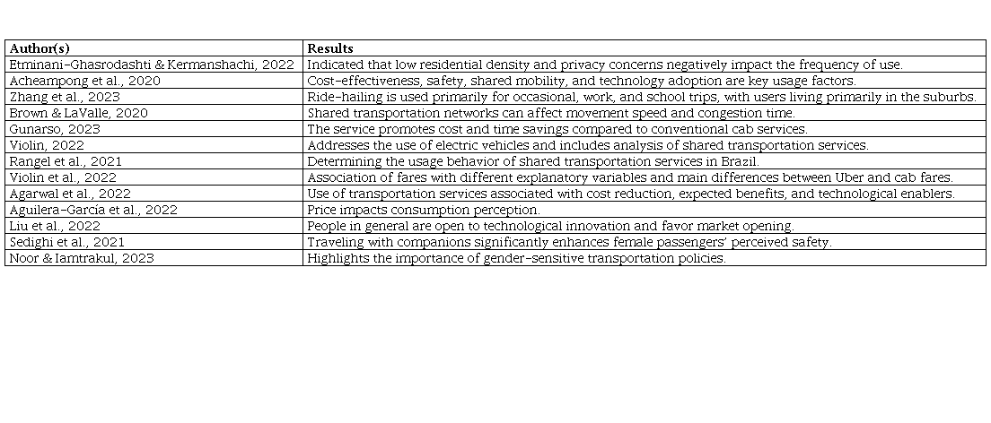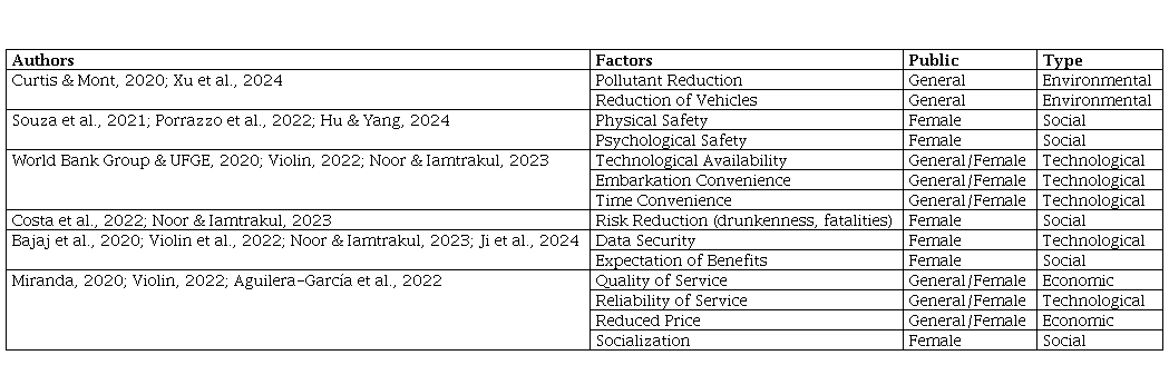Safety emerges as a distinctive factor in the use of ride-hailing services by women in Brazil, as underscored by studies like those by Souza et al. (2021). National studies offer a localized perspective on the motivations and specific challenges faced by Brazilian women when using ride-hailing services, contributing to the understanding of cultural and social dynamics. The two tables highlight the current gap in information regarding the drivers of female consumer behavior in Brazil, fundamentally linked to inclusive structures. However, they do not provide an in-depth exploration of the theme.
