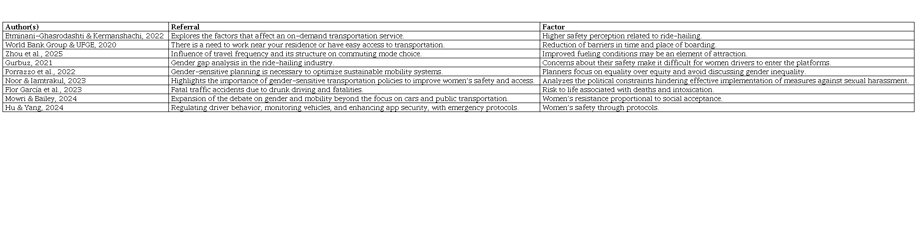 To develop the data collection instrument, a compilation of relevant studies and key authors was consulted, focusing on the factors inducing the use of ride-hailing services, particularly among women. This compilation is presented in the table 5: