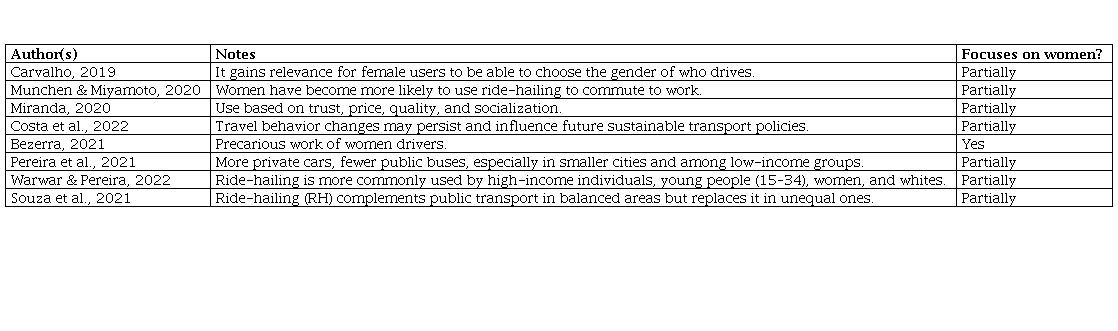 The table illustrates international studies that address the theme of ride-hailing services targeted toward women. It highlights important dimensions such as women's physical and psychological safety, as exemplified by studies from Hu and Yang (2024). Additionally, it includes indicators of women's perceptions of safety, explored by Noor and Iamtrakul (2023), who investigate how safety perceptions influence the choice of on-demand transportation.