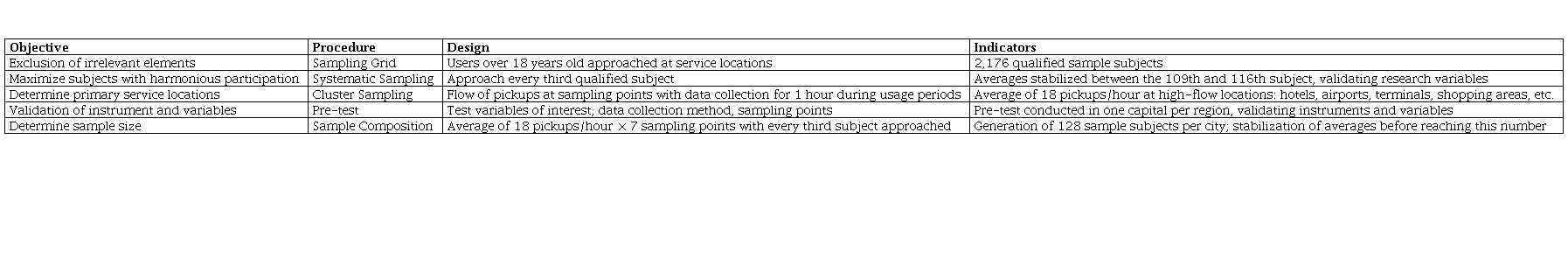 Cluster Sampling was then utilized to determine the primary locations where services occurred, thus informing the sample size. The flow of pickups at each sampling point—including hotels, airports, bus terminals, shopping centers, events, commercial centers, and tourist attractions—was measured for one hour during three different periods of the day (morning, afternoon, and evening), initially in five Brazilian capitals—Rio de Janeiro, Porto Alegre, Goiânia, Palmas, and Aracaju—between October 2023 and March 2024, serving as a pre-test stage. These procedures were later replicated in other cities.