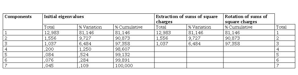 The reliability and consistency of the database were initially ensured through Exploratory Factor Analysis (EFA), based on the total variance explained, as presented in Table 6: