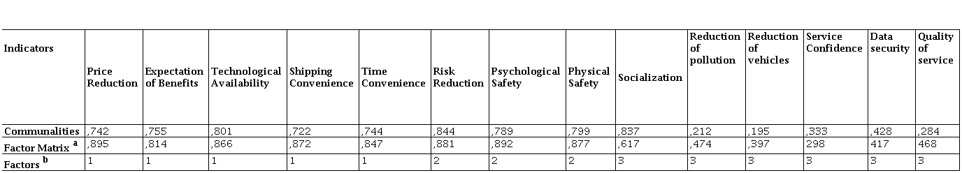 The data reveal a substantial set of values related to the total variance explained of the analyzed variables, with three rotated components accounting for 97.38% of female consumption drivers. It is worth highlighting that this analysis follows the acceptance criterion of values ≥ 0.60, as suggested by Matos and Rodrigues (2019), thus validating the variable set. The factor distribution, as shown in Table 7, presents the variable allocation factors along with their communalities and factor matrix values: