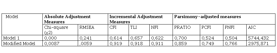 According to the data in the table, Model 1 proves inadequate based on the criteria indicated in the specialized literature. On the other hand, the indicators from the Modified Model reveal elements that demonstrate its adequacy. The likelihood ratio chi-square (χ² ≥ 0.0) indicates that the distance between the observed matrix and the estimated matrix is acceptable (Matos & Rodrigues, 2019).