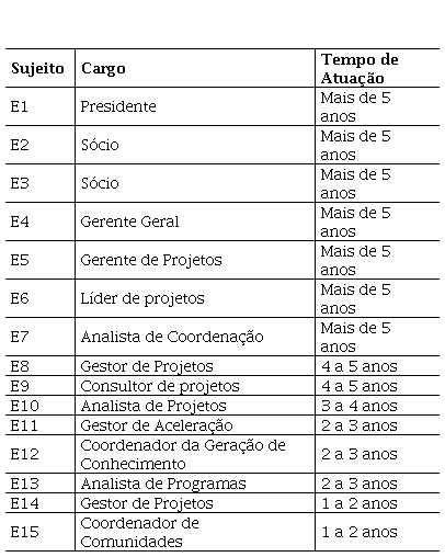 Ao analisarmos o perfil da amostra de entrevistados, apresentado na Tabela 1, observou-se que 60% dos participantes possuem, no mínimo, quatro anos de experiência no ecossistema de impacto. Em relação aos níveis hierárquicos, 13% ocupam posições de presidência ou sociedade, enquanto 47% desempenham funções de gestão, coordenação ou liderança em organizações dinamizadoras do ecossistema de impacto. Esses dados evidenciam a solidez e a relevância da amostra, refletindo a maturidade profissional e a riqueza de experiências acumuladas no campo do empreendedorismo social.