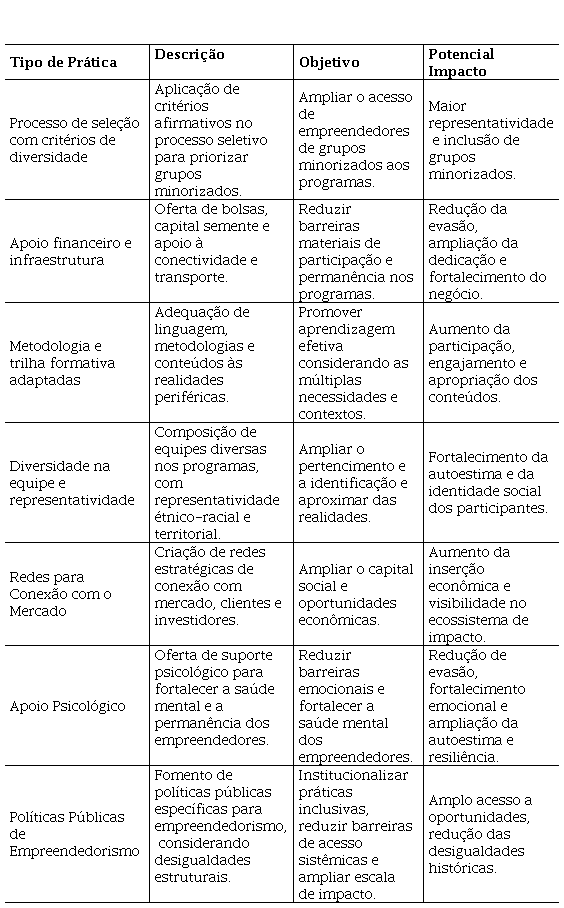 Os dados sugerem que estratégias como a adoção de critérios de seleção sensíveis a marcadores sociais, a disponibilização de recursos financeiros não reembolsáveis, a adaptação linguística e metodológica das trilhas formativas e a presença de equipes representativas, amplia a efetividade dos programas em termos de acesso, permanência e engajamento dos empreendedores da periferia. Além disso, práticas como o apoio psicológico e a implementação de políticas públicas emergem como dimensões complementares e necessárias para a promoção da equidade.
