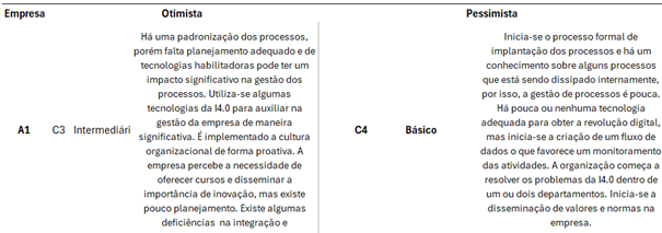 Ao realizar uma comparação geral entre as alternativas, é possível notar que as empresas 2, 3, 5, 7, 10 e 14 permaneceram no mesmo nível. As categorizações pelo procedimento otimista e pessimista são idênticas, indicando consistência no desempenho dessas alternativas independentemente do método de avaliação. Contudo, a empresa 2 está alocada no nível básico, C4. A empresa 3 está alocada no nível intermediário, C3. E as empresas 5, 7, 10 e 14 consistentemente categorizadas como C5, isto é, nível convencional (a pior categoria), sugerindo que essas alternativas apresentam um baixo nível de maturidade em inovação de processos. Neste sentido, todos os limites superam a alternativa, tornando essas empresas no nível mais inferior do método.