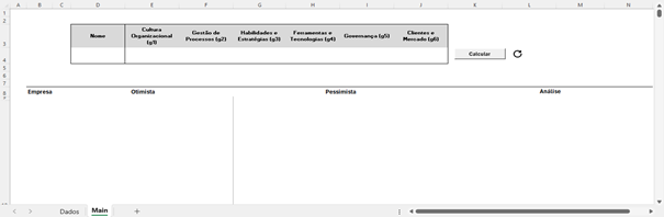 Na ferramenta, há duas abas denominadas "Dados" e "Main". Primeiro, as informações na aba "Main" devem ser preenchidas. Nesta aba, há uma tabela estruturada com colunas correspondentes a diferentes critérios de inovação. O nome da empresa deve ser inserido na célula "D4". Nos campos “Cultura Organizacional