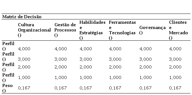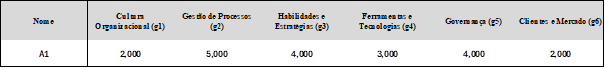 Ao obter as respostas dos questionamentos referentes as situações, foi realizado o cálculo da média geométrica para cada bloco, e assim, foi possível atribuir valores para cada critério a cada alternativa. Conforme é apresentado na Tabela 7.