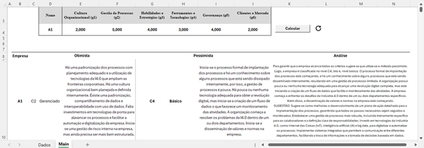 Após realizar o preenchimento, clique no botão “Calcular”. Automaticamente é preenchido os campos “Empresa”, “Otimista”, “Pessimista” e “Análise”, conforme é apresentado na Figura 5.