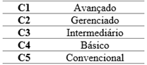 Ainda foram definidas cinco categorias a serem consideradas, sendo relacionadas com os cinco possíveis níveis de inovação conforme apresentado na literatura do presente trabalho. Os cinco níveis de inovação e das categorias consistem em avançado, gerenciado, intermediário, básico e convencional. Logo, as categorias são definidas e apresentadas na Figura 6.