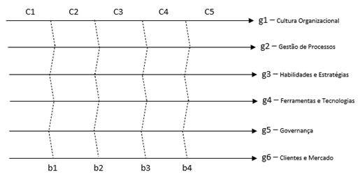 O método é constituído de um conjunto de doze quesitos, sendo dois para cada “bloco”. Os blocos foram definidos de acordo com as seis dimensões em que o método proposto foi estruturado, sendo eles: cultura organizacional, gestão de pessoas, habilidades e estratégias, ferramentas e tecnologias, governança, clientes e mercado. Além disso, as informações são oriundas das seguintes áreas das empresas: produção, gestão de projetos, vendas e marketing, recursos humanos e outros.
