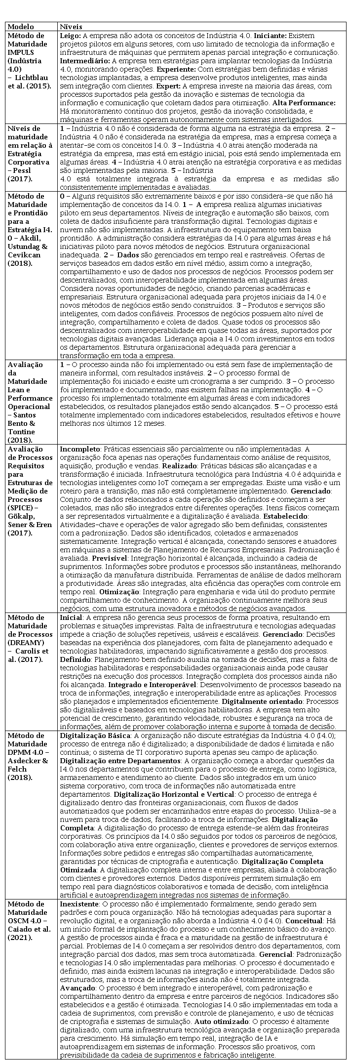 Deste modo, ao analisar o método proposto por Caiado et al. (2021) e Carolis et al. (2017) foi possível identificação semelhanças e diferenças entre os métodos existentes, para que assim, fosse possível estruturar um método mais robusto, abrangente e relevante para as organizações. No método DREAMYS proposto por Carolis et al. (2017) foram definidos cinco níveis de maturidades, sendo subdivididos do 1 ao 5, que consistem em inicial, gerenciado, definido, integrado e interoperado, e digitalmente orientado. Além disso, as dimensões foram: Processos; Controle e Monitoramento; Tecnologia; Organização.