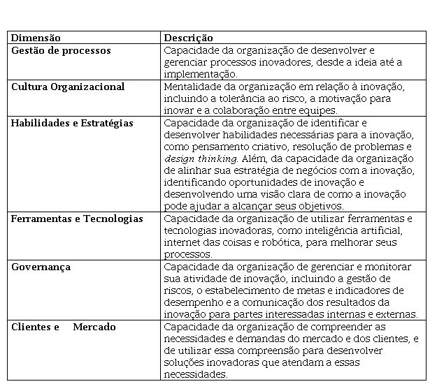 Além do descritor, é importante ter uma descrição mais detalhada de cada nível, que explique em mais detalhes as características que a organização deve possuir para ser classificada naquele nível. Outro ponto relevante consiste na definição do número de dimensões. Isto é, um método de maturidade em inovação de processos geralmente é estruturado em diferentes dimensões, que representam diferentes aspectos da inovação, sejam elas relacionadas aos processos, cultura organizacional, habilidades e ferramentas de inovação.