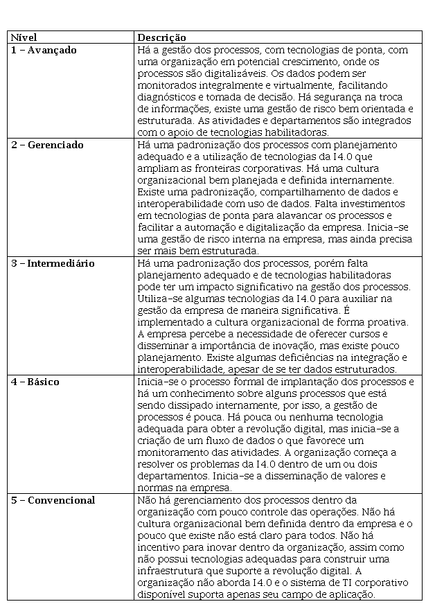 Nesta conjectura, Frank et al. (2019) afirmam que os benefícios esperados com o uso das tecnologias na indústria variam, pois, as sinergias e inter-relações entre diferentes elementos da I4.0 podem levar a um melhor desempenho. É necessário pensar sistematicamente na implementação dessas tecnologias para atingir um nível de maturidade mais alto de I4.0 (Dalenogare et al., 2018). Por isso, é fundamental que as organizações compreendam e conheçam o seu grau de inovação existente, para que consigam fornecer subsídios para acompanhar o desenvolvimento organizacional.